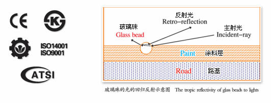 Glass beads is one composition for road marking paint, according to the standard of U.K BS6088-A and BS6088-B, U.S.A AASHTO M247 TYPE I and AASHO M247 TYPE II, Europe Drop On Type EN 1423 AND Pre-MIX Type EN 1424, Australia AS2009 B3.2, Korea KS, except of the Chinese standard.